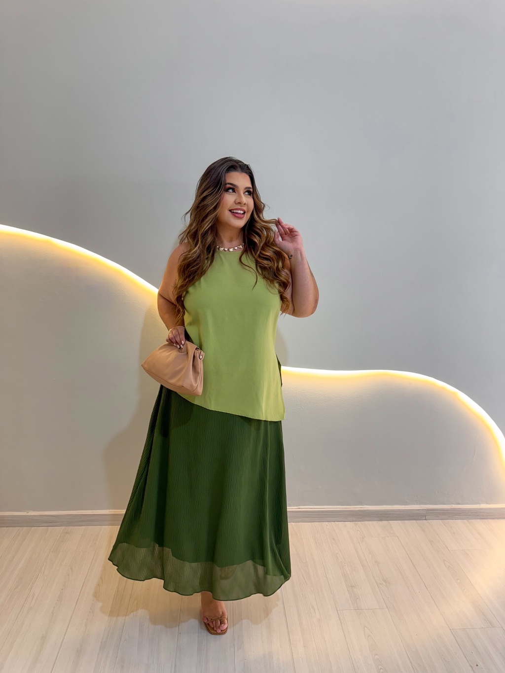 Com uma pala frontal lisa na cintura, a Saia Linday possui um elástico na parte de trás que se adapta perfeitamente ao corpo, proporcionando um caimento incrível. O plissado ondulado adiciona um charme especial, tornando essa peça ideal para diversas ocasiões, desde um passeio casual até um evento mais formal.